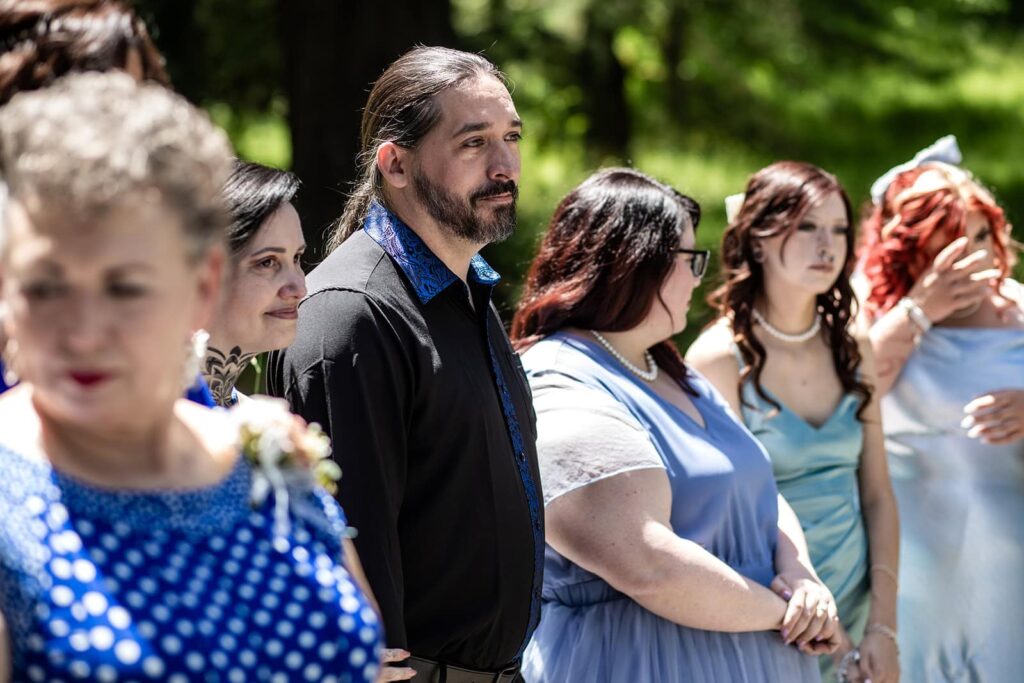 After the ceremony, we gathered for family photos among the tall trees. The soft forest light framed everyone beautifully, and the cool tones of their outfits harmonized perfectly with the surroundings. These portraits reflected the joy and calm that defined the day. The energy stayed easy and unhurried, which is exactly how a Hoyt Arboretum wedding should feel. Moments like these are what make being a Minnesota wedding photographer so rewarding, when people forget about the camera and just enjoy being together.