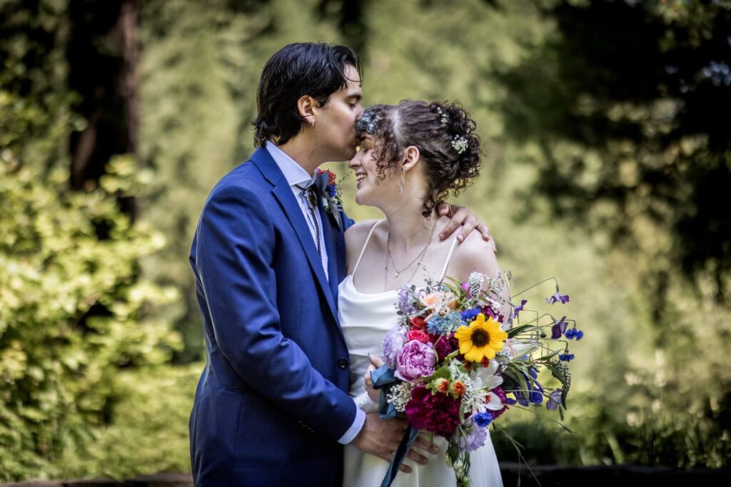 Hoyt Arboretum offers several breathtaking ceremony sites. The Redwood Deck sits among towering redwoods, while the Wedding Meadow stretches open under a Douglas-fir canopy. For their ceremony, Maya and Erik chose the Stone Circle, tucked along the Bristlecone Pine Trail, where the sound of the wind moves softly through the trees. The stillness made it ideal for a small, intimate gathering. This Hoyt Arboretum wedding felt deeply connected to its setting, letting the natural world play a central role in their story.