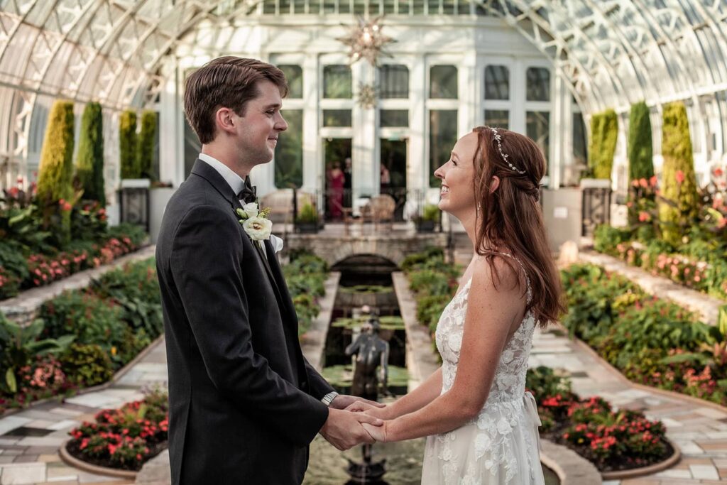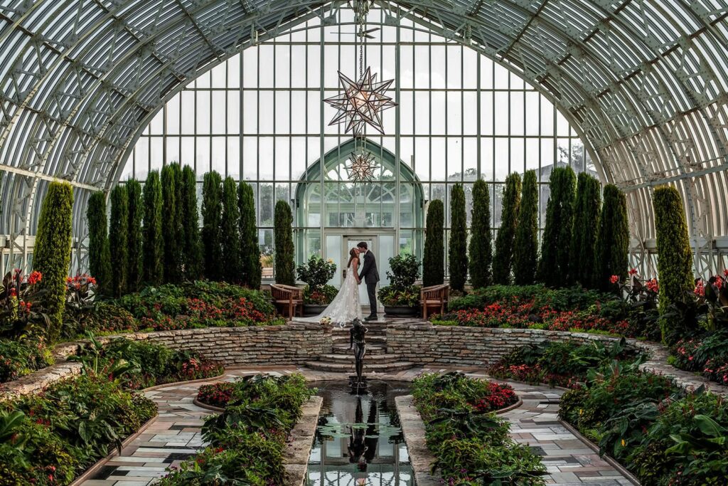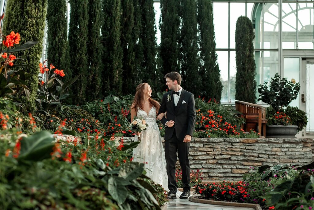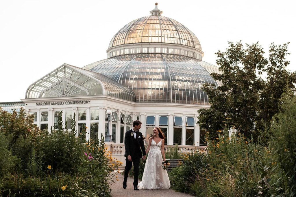For couples who love lush greenery, the Como Park Conservatory and its Sunken Garden are perfect for timeless portraits. This location offers year-round color and atmosphere, with tropical plants and seasonal blooms that bring vibrancy to every photo. As a Minnesota wedding photographer, I find that the glass dome architecture lets in soft, even light that flatters every couple. It’s ideal for engagement and wedding photos in St. Paul and Minneapolis because it captures the region’s natural charm while keeping couples comfortable regardless of the weather.